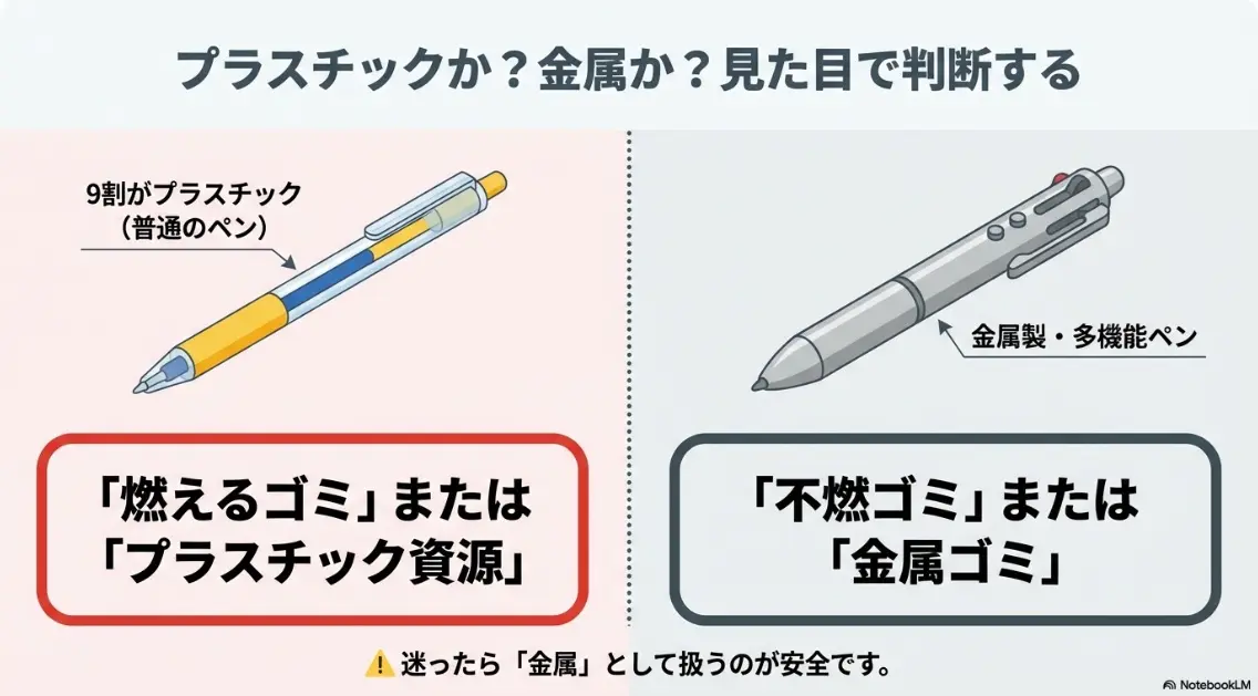多くの自治体(名古屋市など)では、金属との複合製品でも、大半がプラスチックであれば可燃ゴミというルールを採用しています。これは、小さなバネやペン先の金属チップ程度であれば、現代の高温焼却炉で処理しても問題ない、あるいは焼却後の灰から磁力選別で金属を回収できるためです。