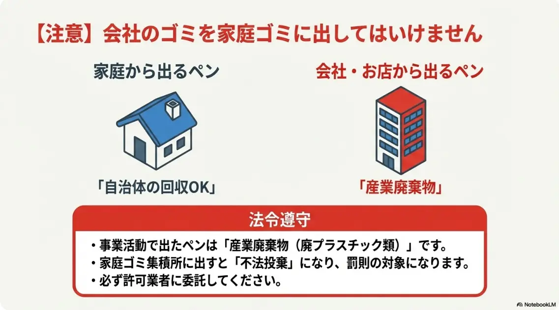 意外と知られていないのが、仕事で使ったボールペンの扱いです。会社や店舗、病院、学習塾などの事業活動に伴って出たゴミは、法律上、事業系ごみと呼ばれ、家庭ゴミとは明確に区別されます。
