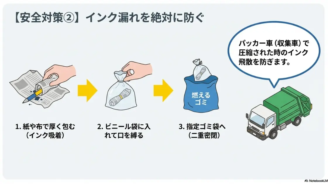 - インク漏れなどのトラブルを防ぐ安全な処分の手順