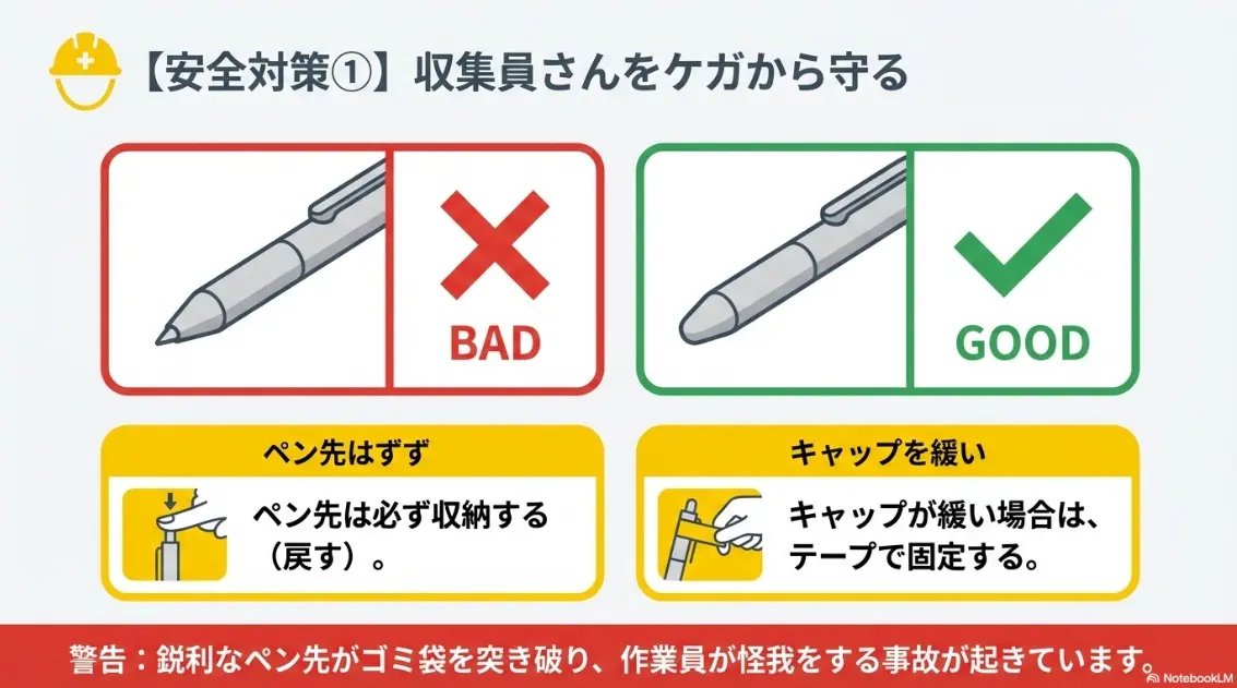 まずは、次回のゴミ出しの日にペン先を収納して包むことから始めてみませんか?そんな小さな優しさが、街の美化と資源の循環を支える大きな力になるはずです。